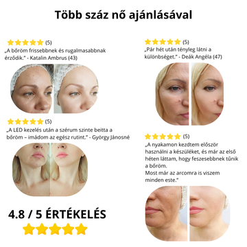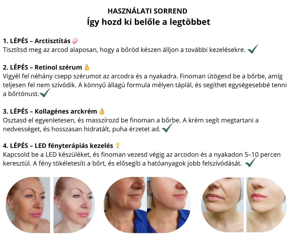 - LED fotonterápia: Serkenti a kollagéntermelést, javítja a bőr rugalmasságát.