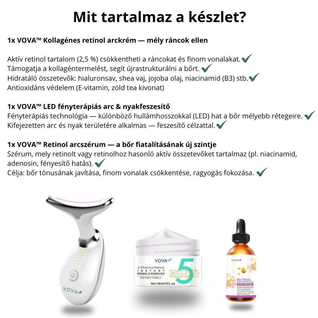 A VOVA készlet tartalmaz egy LED fényterápiás arc- és nyakfeszítőt, kollagénes retinol arckrémet és retinol arcszérumot, melyek együttesen segítik a bőr megújulását, feszesítését és a ráncok csökkentését. A készlet fiatalos és ragyogó bőrt eredményez.